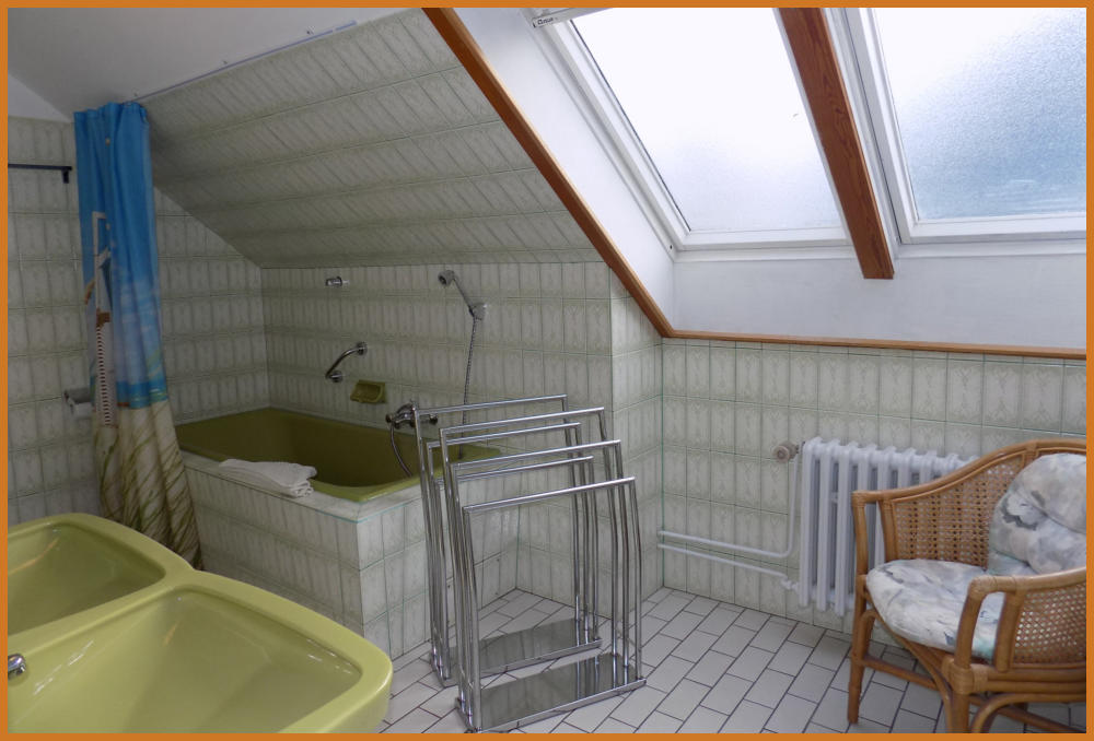 Bad mit Badewanne, Doppelwaschbecken und WC.